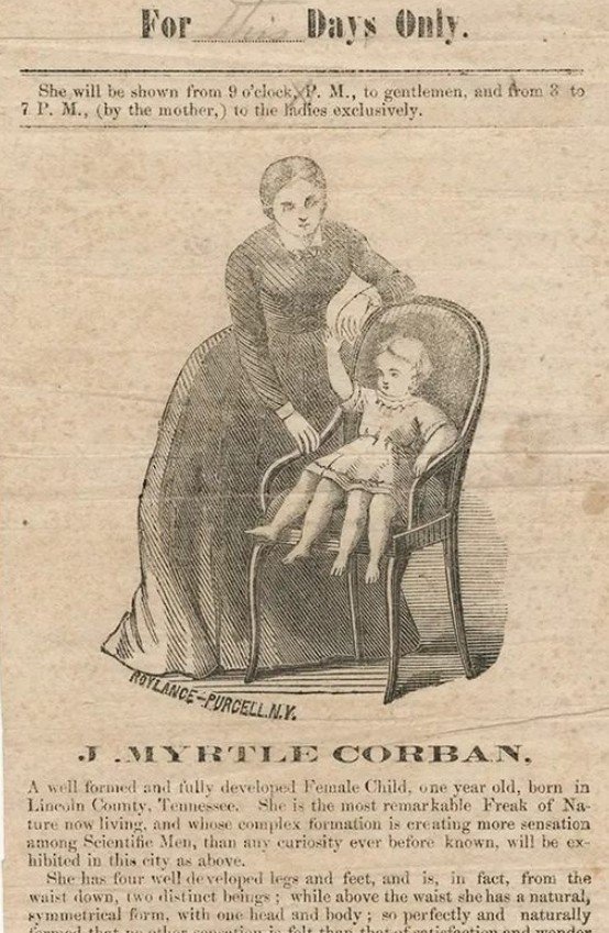 Введение. Джозефина Миртл Корбин (Josephine Myrtle Corbin) родилась 12 мая 1868 года в округе Линкольн, штат Теннесси, США, с крайне редким врождённым состоянием — дипигус. Это значит, что нижняя часть её тела развилась с двумя тазами и четырьмя ногами. Её история — пример силы воли, мужества и стремления к полноценной жизни.